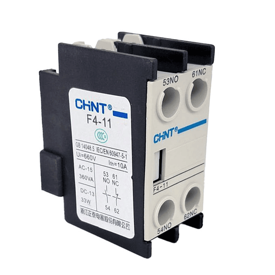 Accesorio que permite agregar dos salidas ,1 Normalmente abierto y 1 normalmente cerrado, se enclava en la parte frontal del contactor Chint modelos NC1 o NC2